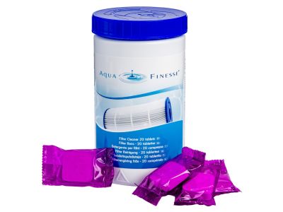 De AquaFinesse Filtercleaner is een handig tabletvormig reinigingsmiddel voor filters van spa’s, hottubs en bubbelbaden. Door het filter in een oplossing van heet water en tabletten te weken, verwijder je grondig vetten, vuil en bacteriën die zich in het filter ophopen.