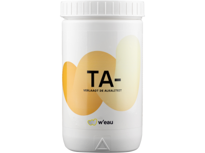 W'eau TA- is een poeder dat je gebruikt om de totale alkaliteit van je zwembadwater te verlagen. Een stabiele alkaliteit helpt om de pH-waarde goed in balans te houden, wat weer zorgt voor rustiger en beter te onderhouden zwemwater. Je kunt dit product gebruiken als testen aangeven dat je TA-waarde te hoog is. Met 150 gram poeder per 10 m3 water verlaag je de alkaliteit met ongeveer 10 ppm.